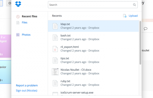 Click on the icon corresponding to your Cloud service to attach files it contains. If you are not logged in on your you will have to enter your credentials directly in the cloud service. Once you are authenticated, a file picker allows to pick the file you want to attach.