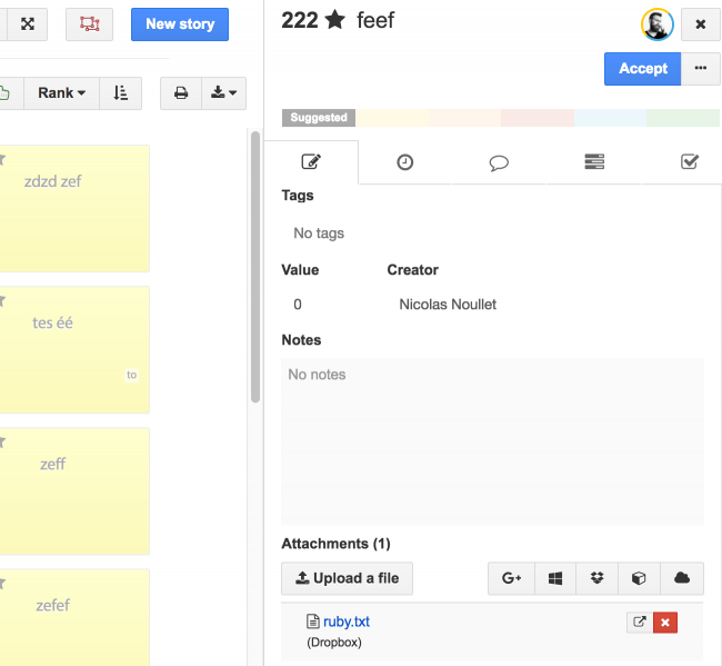 Once the administration is configured, you should be able to enable the App corresponding to the service you want to integrate with on your project. Just like regular attachments, cloud ones can be added at the project, release, sprint, feature, story and task levels. Once your App is enabled, the cloud attachment icon will be available next to the attachment button.