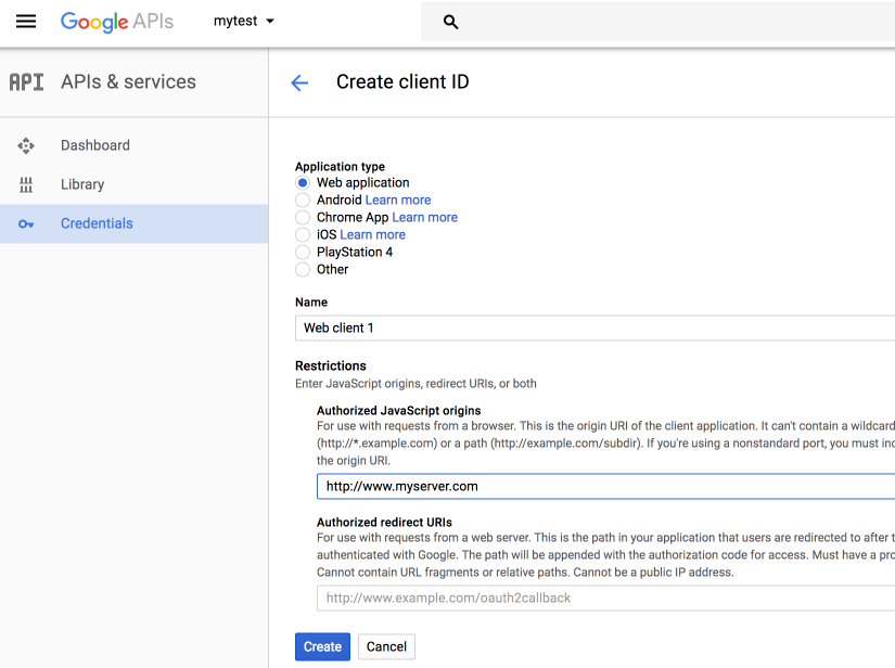 Then, choose Web application, enter your iceScrum server domain in the Authorized JavaScript Origins.