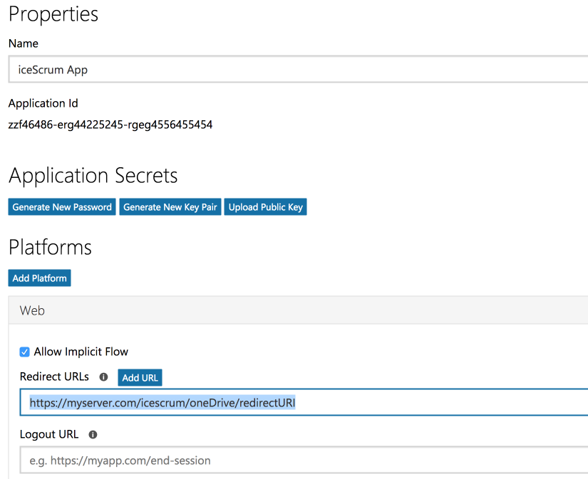 Then, enter your full iceScrum server URL in in the Redirect URLs followed by /oneDrive/redirectURI and copy the Application ID.