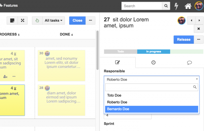 Once it is enabled, this App adds a new drop-down menu on tasks details that allows ScrumMasters to define or change the responsible of the task among any Team member, ScrumMaster or Product Owner of the project.