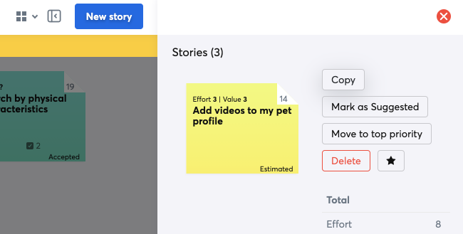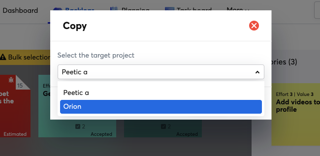 Para copiar historias entre proyectos, usa el menú de copia normal. Si usted es Dueño del producto tanto del proyecto actual como del que desea copiar la historia, una ventana emergente le ofrecerá automáticamente la opción de copiar.