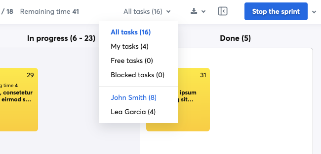 Para trabajar de manera eficiente, es posible que desee saber en qué tareas está trabajando un compañero de trabajo. Esta aplicación brinda la capacidad de filtrar el tablero de tareas por usuario.