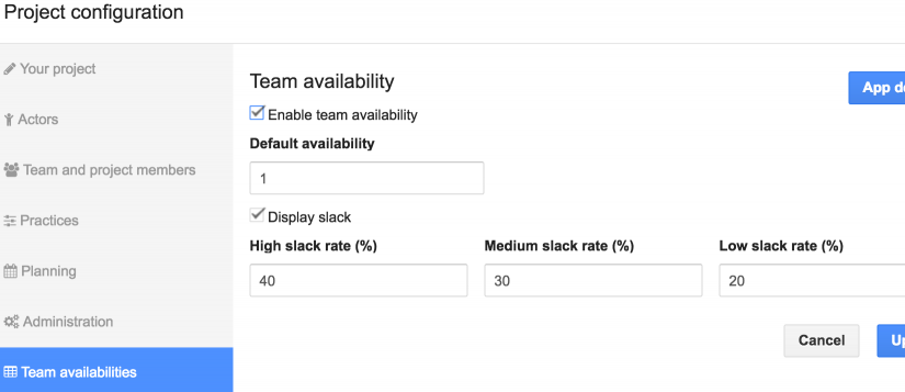 Un projet peut être risqué et nécessiter beaucoup de mou tandis qu’un autre, avec un contexte bien connu, peut nécessiter moins de mou. Vous pouvez adapter le jeu de couleurs en fonction de ce contexte en modifiant les seuils dans les paramètres de votre projet, dans la section « disponibilités de l’équipe ».