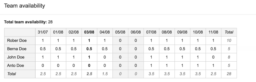 Le tableau affiche les disponibilités totales par jour, par utilisateur et pour l’ensemble du sprint. Les disponibilités du jour sont en caractères gras et les disponibilités de fin de semaine sont en fond gris.