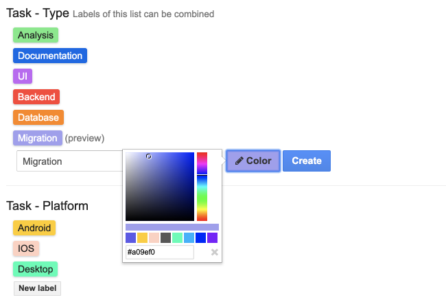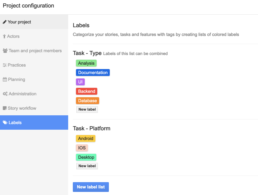 De plus, en tant que Product Owner ou ScrumMaster, vous pouvez créer de nouvelles listes de labels qui sont limitées à un type spécifique d’item (Story, Feature ou Task), ajouter ou supprimer des labels, changer leur couleur…. Cela se fait à partir d’une section dédiée dans les paramètres de votre projet.