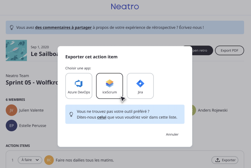 Depuis votre rétrospective Neatro, l’App permet d’exporter individuellement vos actions de rétrospective vers iceScrum afin de s’assurer qu’elles seront bien pris en compte dans vos prochains sprints.