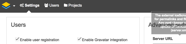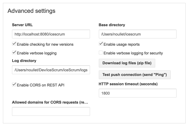 Configuration avancée d’iceScrum. La plupart des changements nécessiteront un redémarrage.