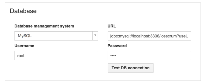 Configurez la connexion au serveur de base de données. iceScrum supporte les principaux SGBD du marché. Utilisez le bouton « Test », et si la connexion fonctionne vous devrez redémarrer pour qu’elle prenne effet.