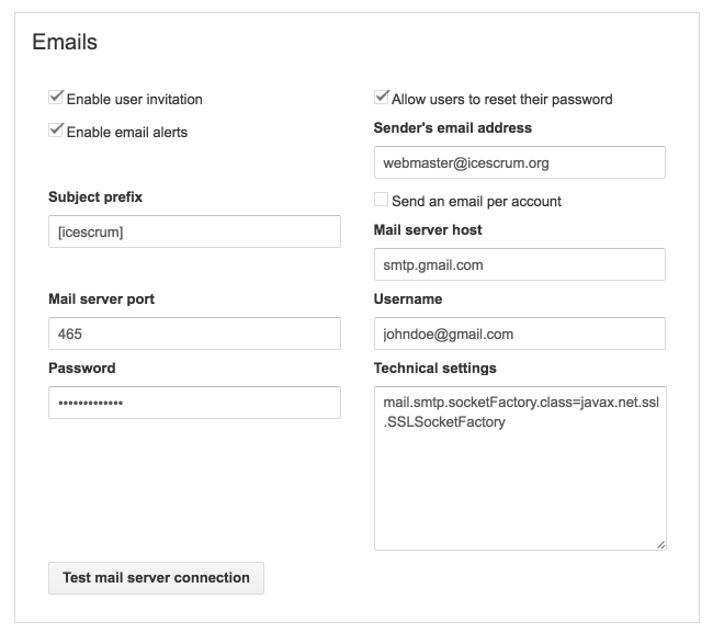 Plusieurs fonctionnalités importantes d’iceScrum se reposent sur la capacité à envoyer des emails, telles que les invitations, les notifications quand des stories sont mises à jour ou la récupération de mot de passe. Pour envoyer ces emails, iceScrum a besoin d’être connecté à un serveur SMTP.