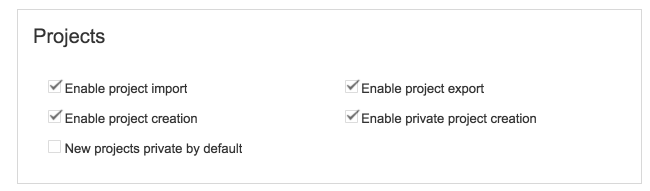 Configuration générale des permissions sur les projets. Ces permissions n’affectent pas l’administrateur du serveur, qui pourra toujours gérer les projets.