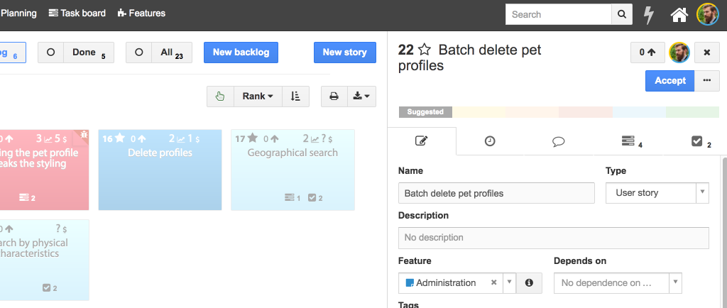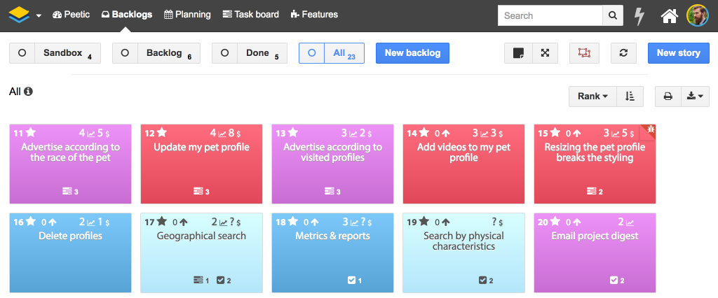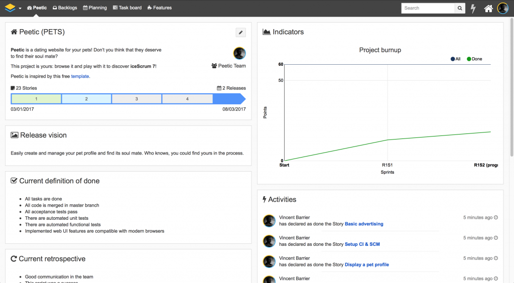 To discover a tool, starting from scratch can be intimidating. Every user can now create a sample project named "Peetic" (a dating website for your pets!) in order to get acquainted with iceScrum.